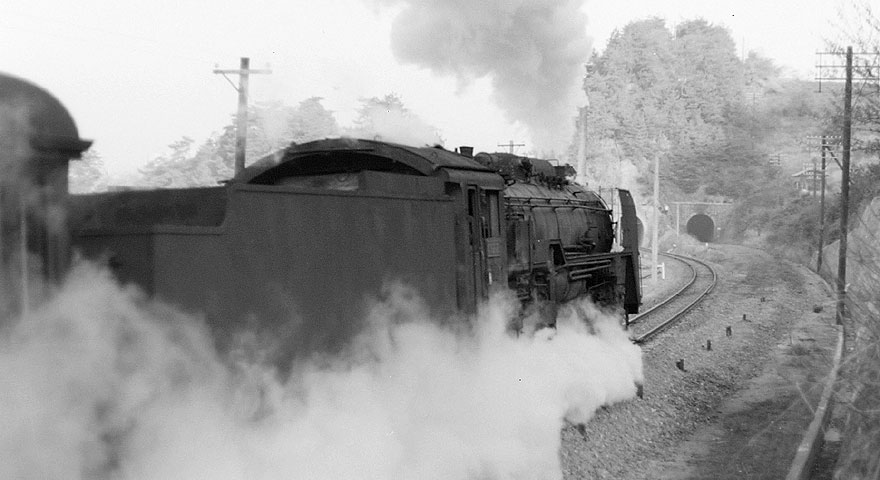 ▲38列車,急行安芸.C62 37.安芸川尻−安登.電柱の間を蒸気を吐きながら登ってくる.